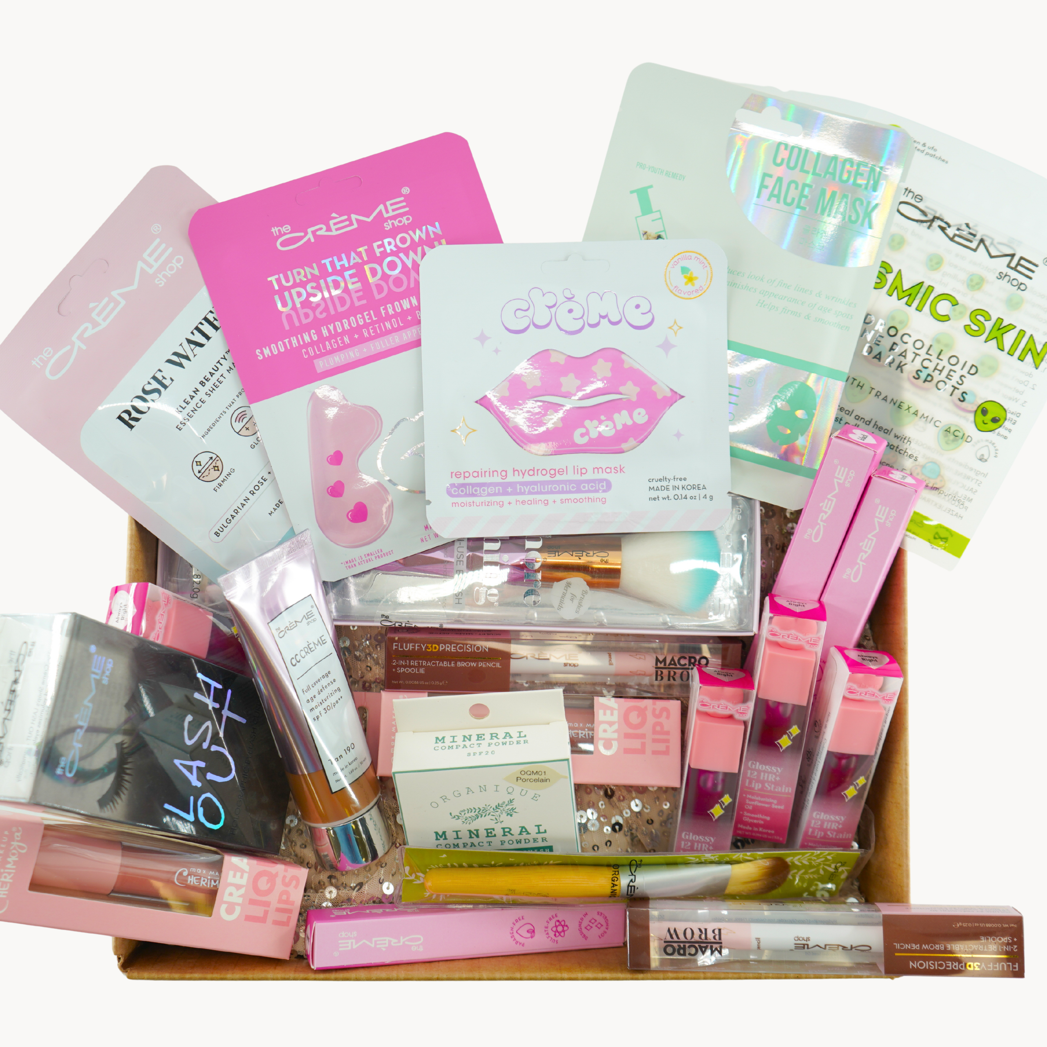 Incluye maquillaje y skincare: labiales, brochas, mascarillas y más. Todo nuevo y de calidad.